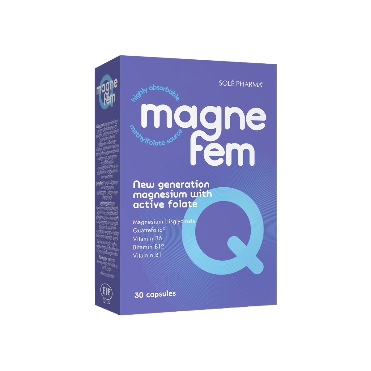 Magnefem Q შეიცავს უახლესი თაობის მაგნიუმს, ვიტამინებით დამატებული ამინომჟავის ქელატის სახით. მაგნიუმი ხელს უწყობს ჯანმრთელი ძვლებისა და კბილების შენარჩუნებას, ასევე ხელს უწყობს კუნთების ნორმალურ ფუნქციონირებას, ელექტროლიტების ბალანსს და ცილების ნორმალურ სინთეზს. ვიტამინი B6 ხელს უწყობს ცილების და გლიკოგენის ნორმალურ მეტაბოლიზმს და ჰორმონალური აქტივობის რეგულირებას. ფოლიუმის მჟავა ხელს უწყობს სისხლის წარმოქმნას. ვიტამინი B12 და ვიტამინი B6 ხელს უწყობს სისხლის წითელი უჯრედების ფორმირებას. თიამინი, ვიტამინი B6, ვიტამინი B12 და მაგნიუმი ხელს უწყობს ნერვული სისტემის ჯანსაღ ფუნქციონირებას და ფსიქოლოგიურ ფუნქციას. ფოლიუმის მჟავა, ვიტამინი B6, ვიტამინი B12 და მაგნიუმი ხელს უწყობს დაღლილობის სინდრომის შემცირებას.